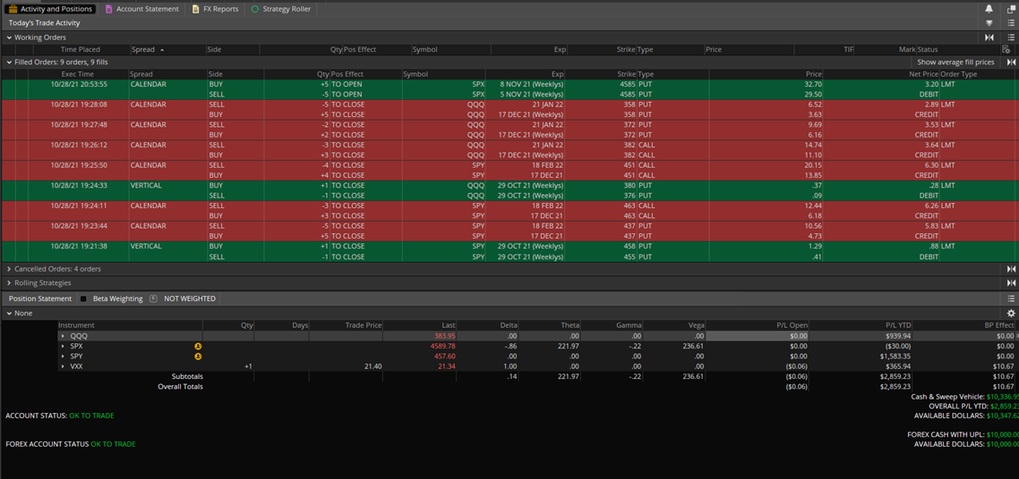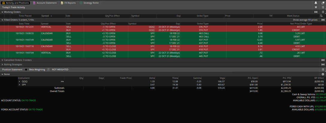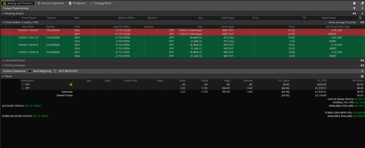 The SPY continued to move up and touched the upper Calendar strike. Therefore, it is better to implement the Calendar swap (closing the lower strike and opening a new Call Calendar at an upper strike at 30 Delta). I also removed the Short Put Vertical that was producing positive Delta and captured some profits. Additionally, I adjusted the trade structure and Delta with additional Calendars at the former middle (now lower strike).