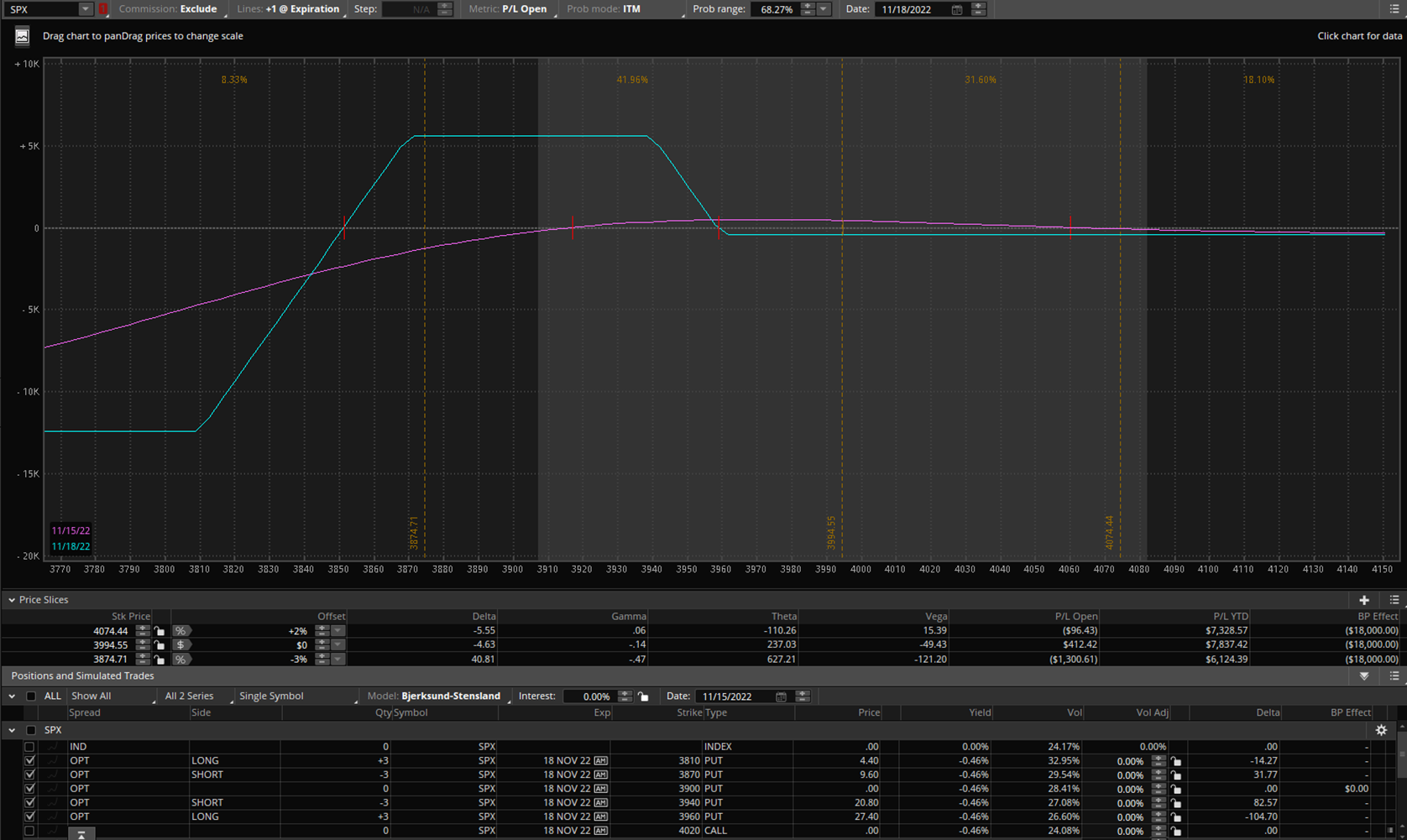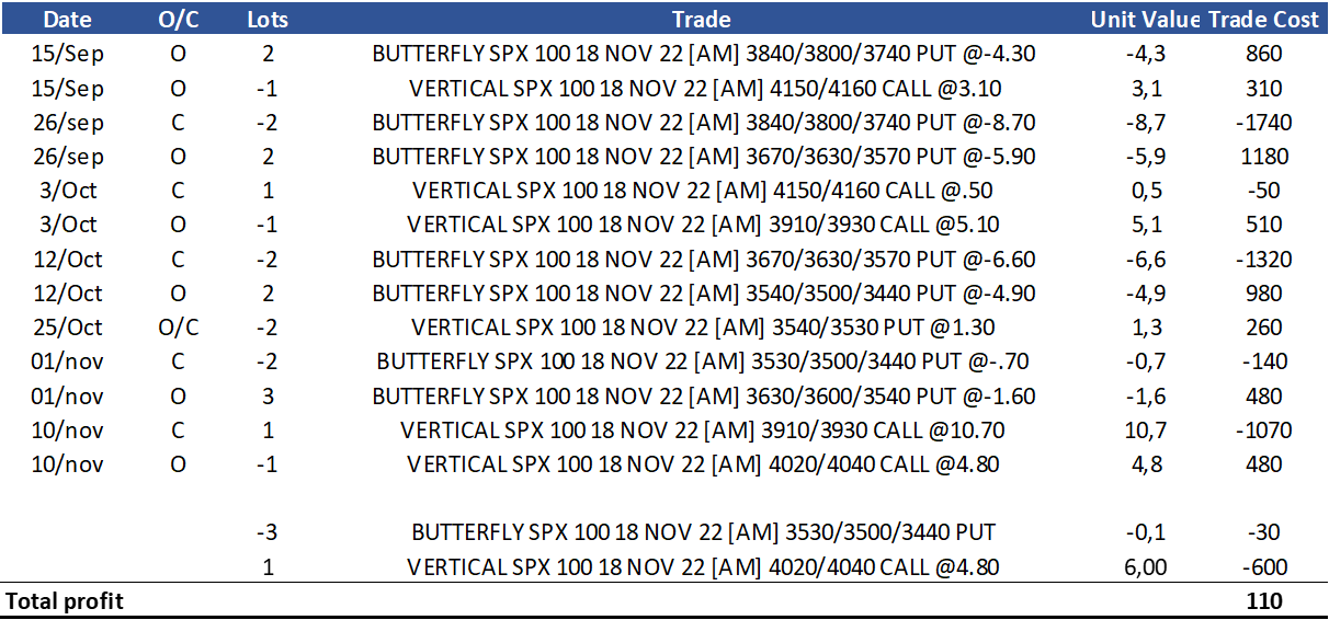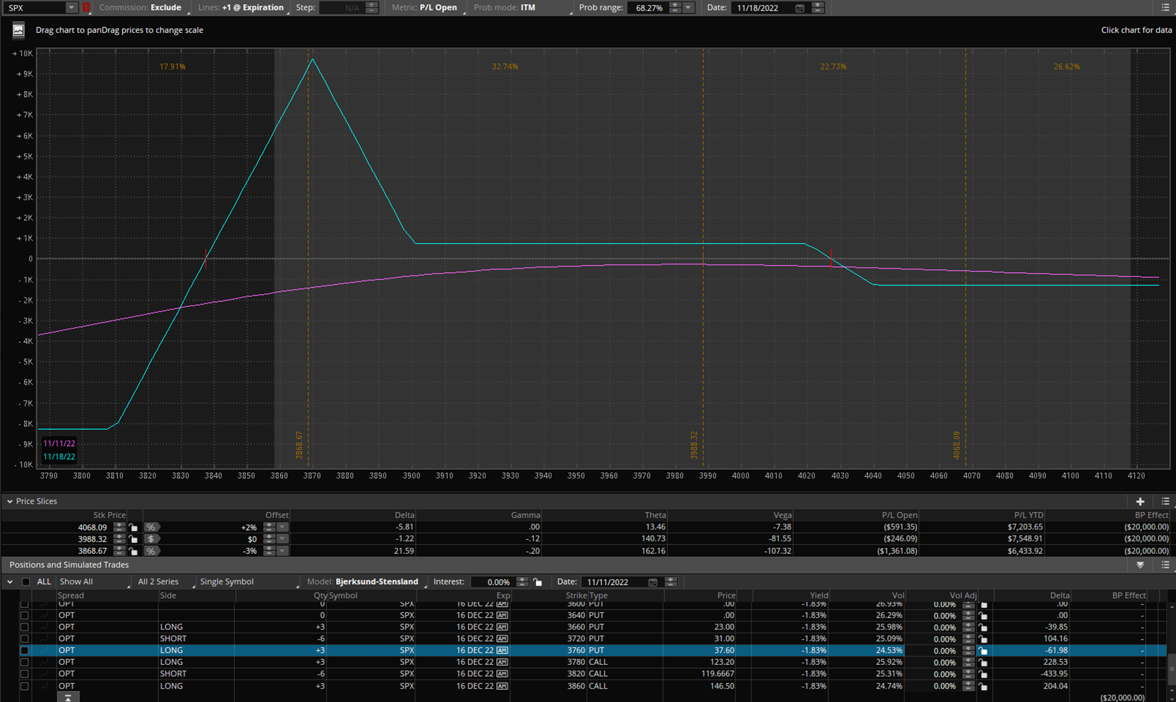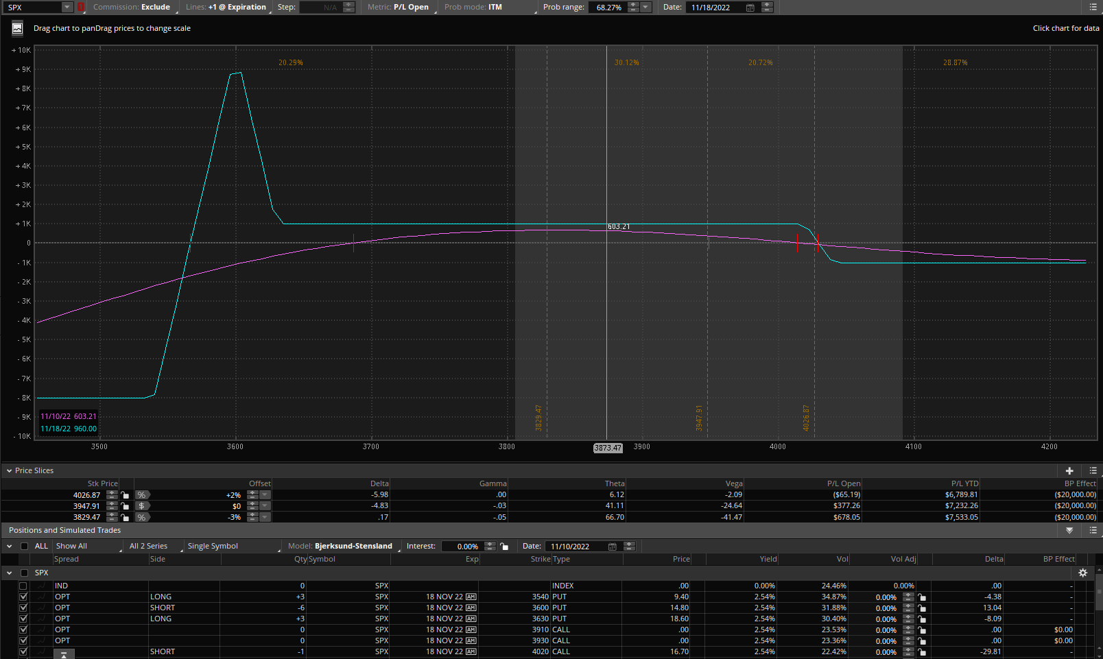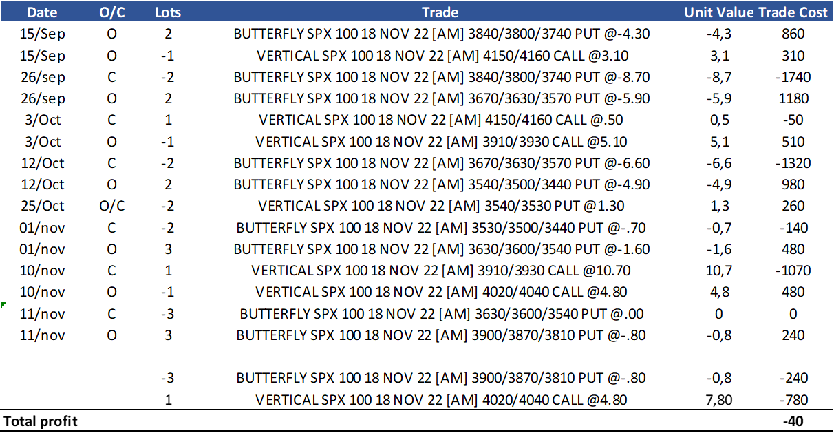 Again, today is a positive day for SPX. I decided to move the butterfly structure up to capture a bit more premium and increase Theta. Next week is the expiration week of the Nov options and Theta will increase a lot. And if the SPX price continues above the butterfly structure it will protect in case of a selloff. Meanwhile, the 4000 level is not yet broken. We should monitor closely this trade and capture nice profits from Theta, mainly.