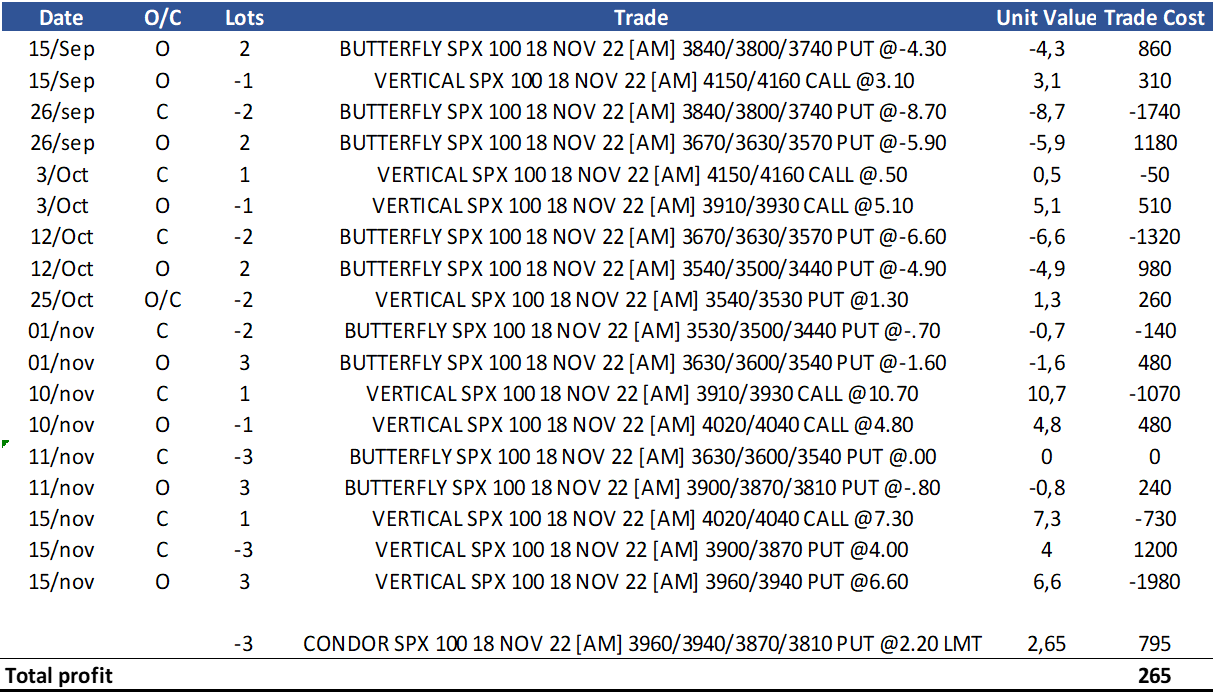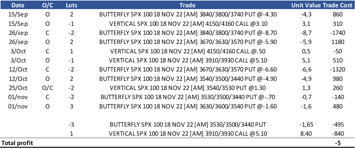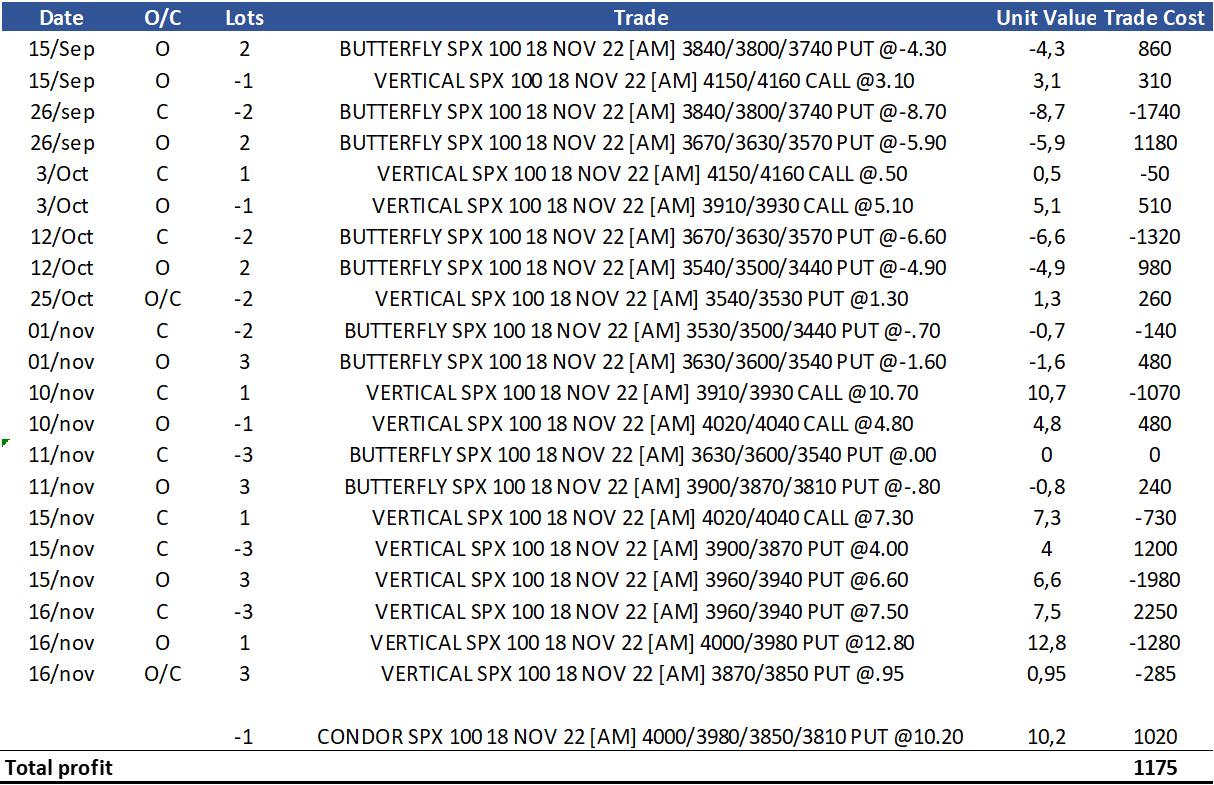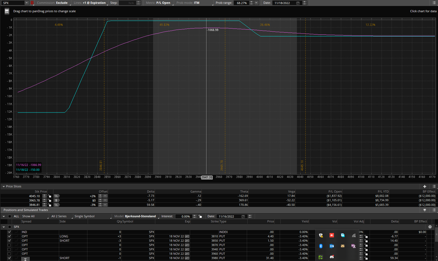 Again, today is a positive day for SPX. I decided to move the butterfly structure up to capture a bit more premium and increase Theta. Next week is the expiration week of the Nov options and Theta will increase a lot. And if the SPX price continues above the butterfly structure it will protect in case of a selloff. Meanwhile, the 4000 level is not yet broken. We should monitor closely this trade and capture nice profits from Theta, mainly.