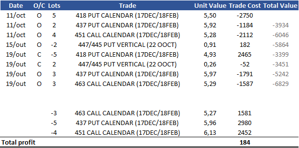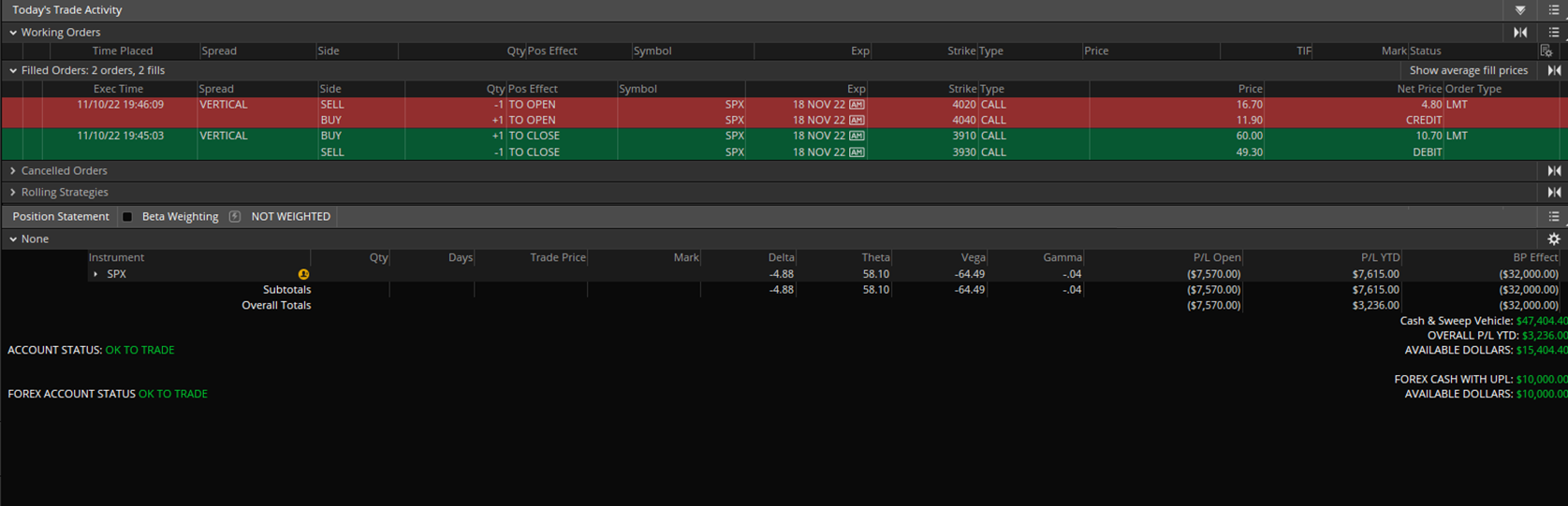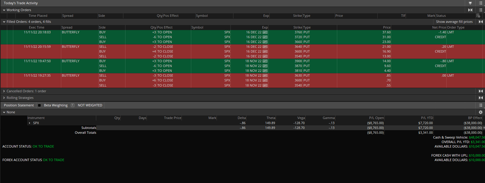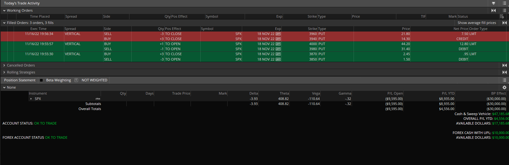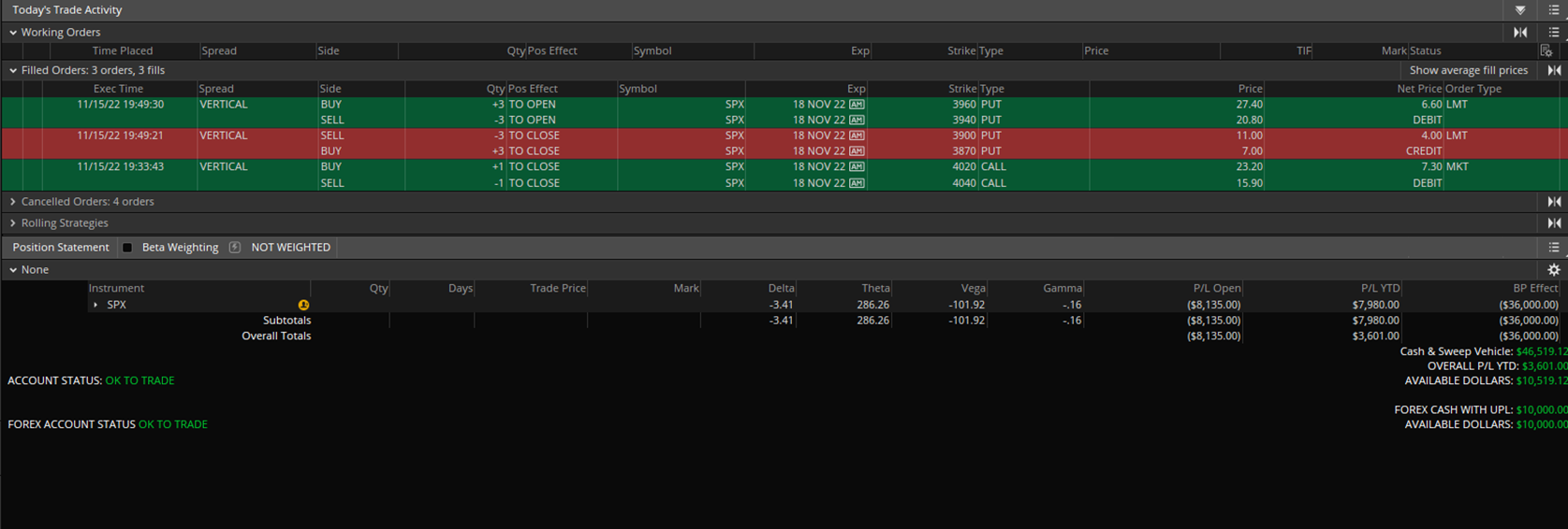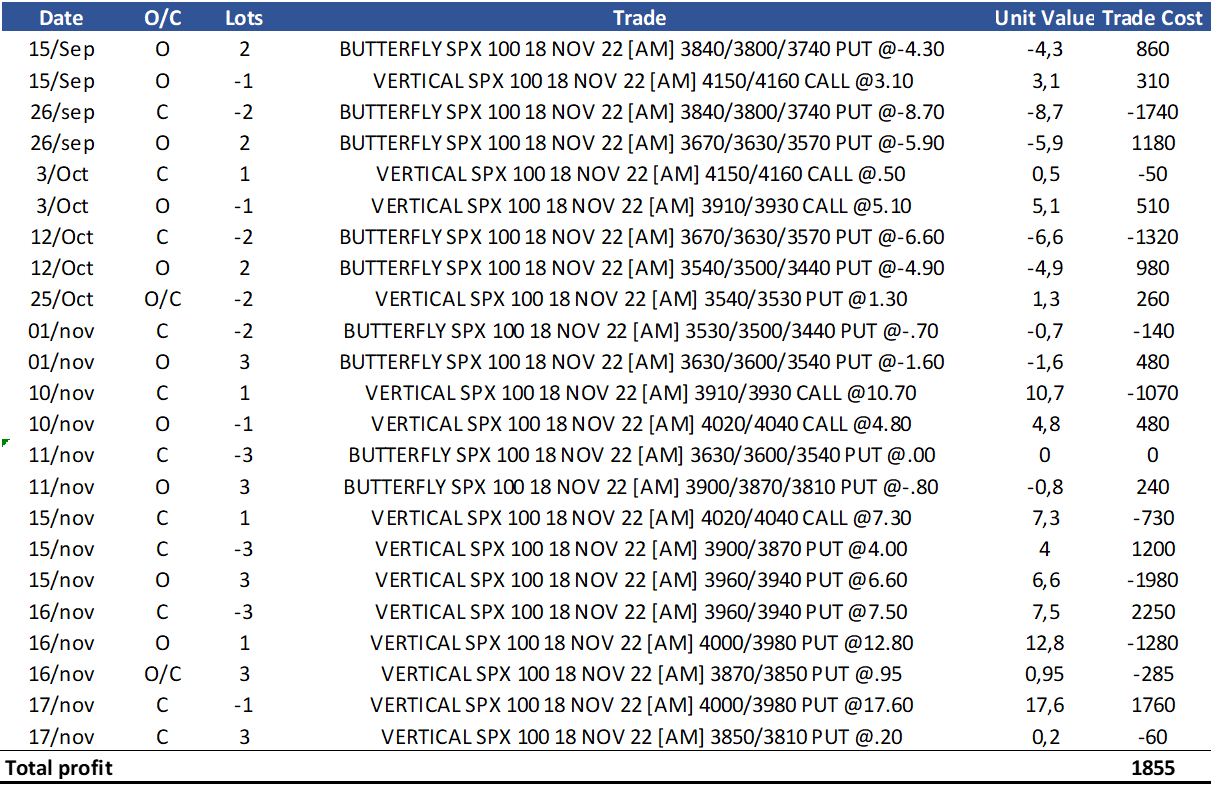 Again, today is a positive day for SPX. I decided to move the butterfly structure up to capture a bit more premium and increase Theta. Next week is the expiration week of the Nov options and Theta will increase a lot. And if the SPX price continues above the butterfly structure it will protect in case of a selloff. Meanwhile, the 4000 level is not yet broken. We should monitor closely this trade and capture nice profits from Theta, mainly.