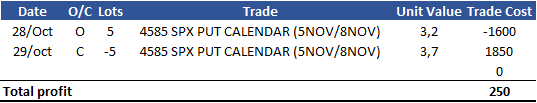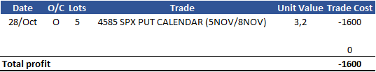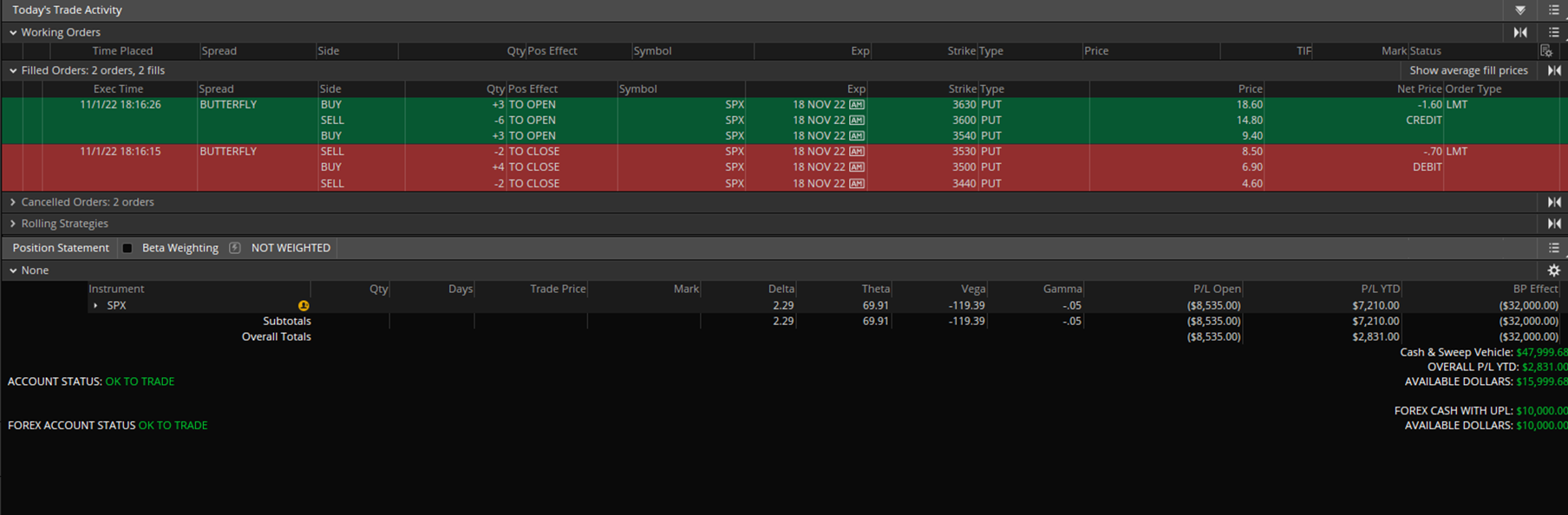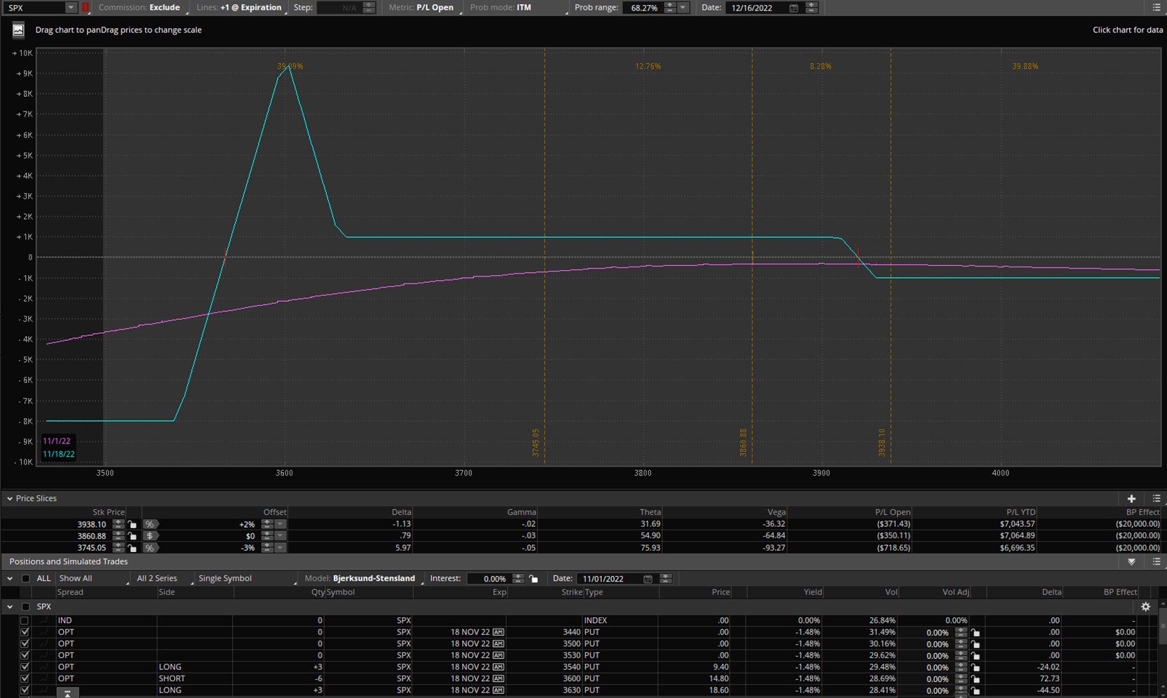 The SPX is trying to break the strong resistance at 3900 and is retracting a bit. I feel the market is now calmer and it should not go lower than 3640 until the Nov expiration (18NOV) - the SPX is now in a positive trend. Obviously, we never know... This is my judgment. Since the Butterfly structure was too far down and not contributing too much for the trade, I decided to move it higher (added an additional lot as I had available cash). I chose the 3600 strike price for the short Puts of the new Butterfly because they are below the strong support at 3640.