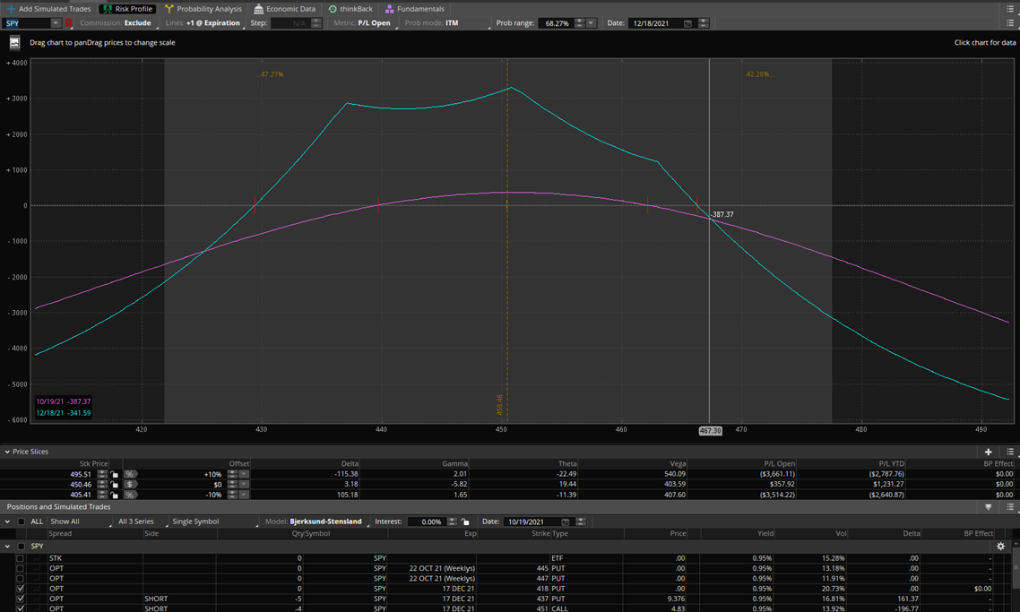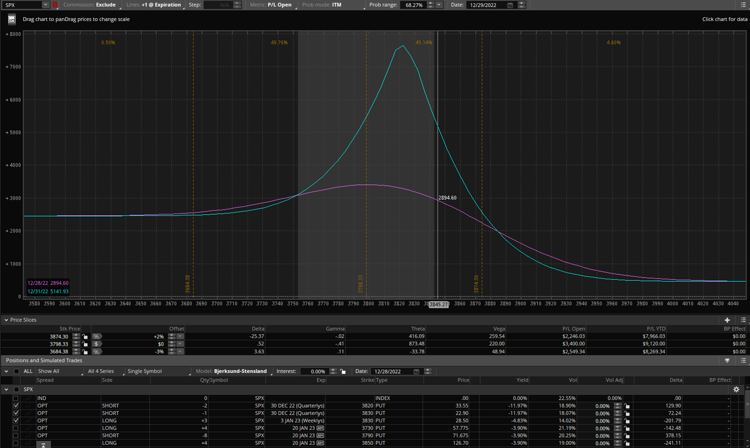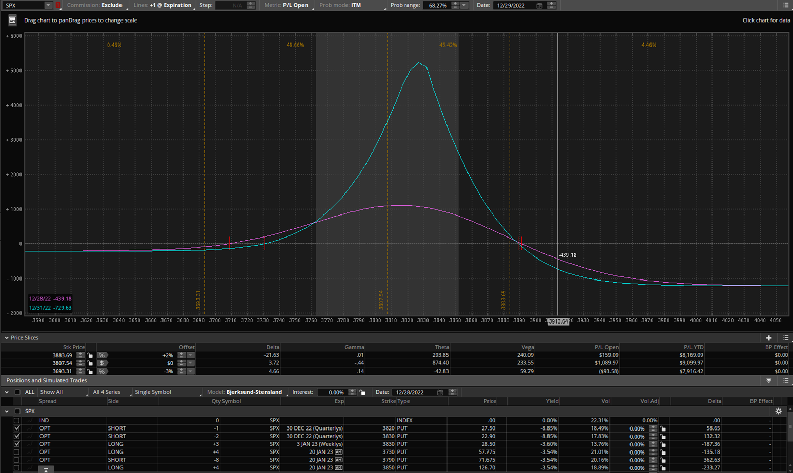 After the adjsutments, the trade shows a flat t0 line in the SPX price region. The trade is doing very well at the moment (unrealised profit of $1000) due to decrease in IV since it was opened as well as positive Delta.