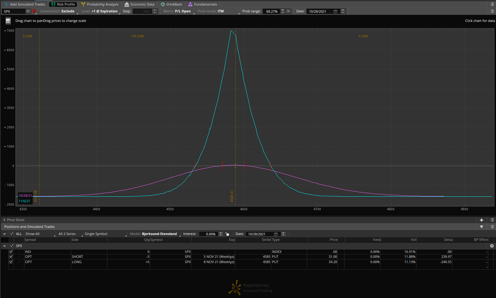 I moved up the "soft hedge, maintaining the 30 width strikes. I positioned the short strike at 5800, above the strong resistance at 5780.