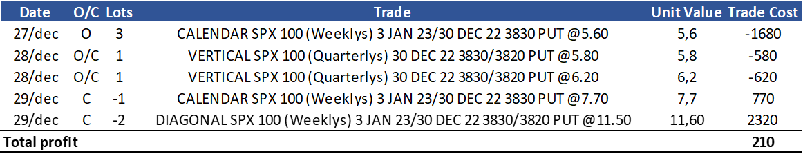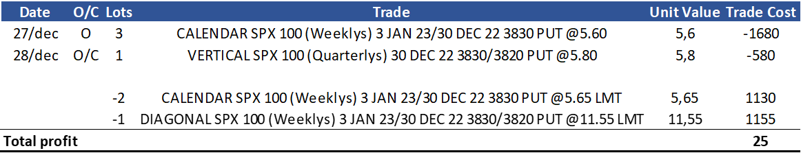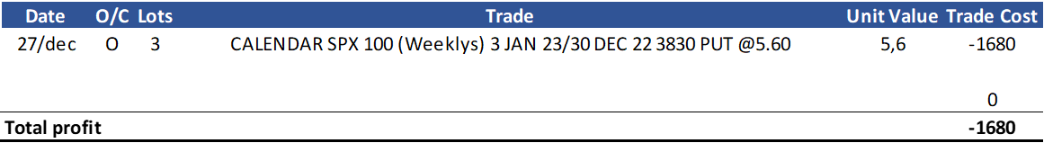 For a long time, I did not open this type of trade. Today I took this decision because I feel the market is slow due to "vacations" period. The expirations in this Speed Trade are very aggressive. The front-month is on 30th Dec, which is next Friday (3 DTE)... and the back month is 3 Jan (7 DTE). This pair presents an attractive IV structure as the front option is at 19% and the back option is 15%, turning this trade cheaper. Tomorrow, I am expecting to close this trade and collect some profits... remember this is a very aggressive trade!