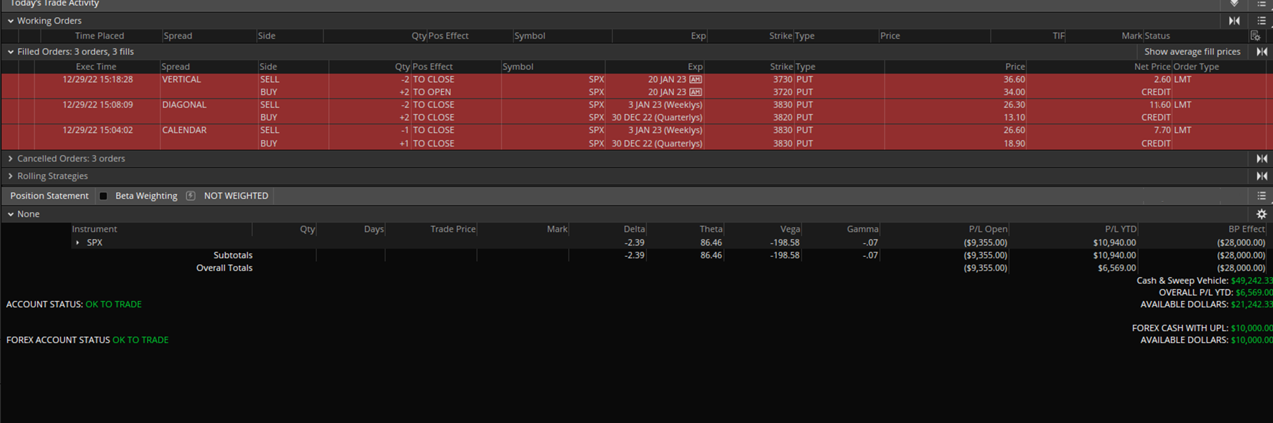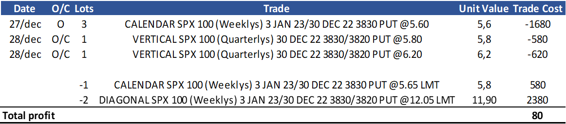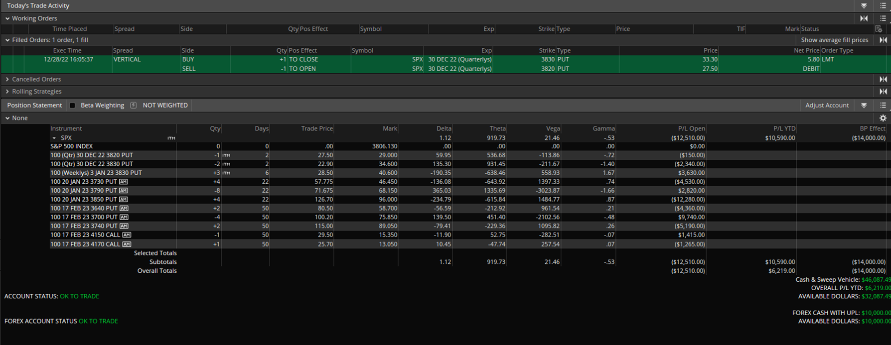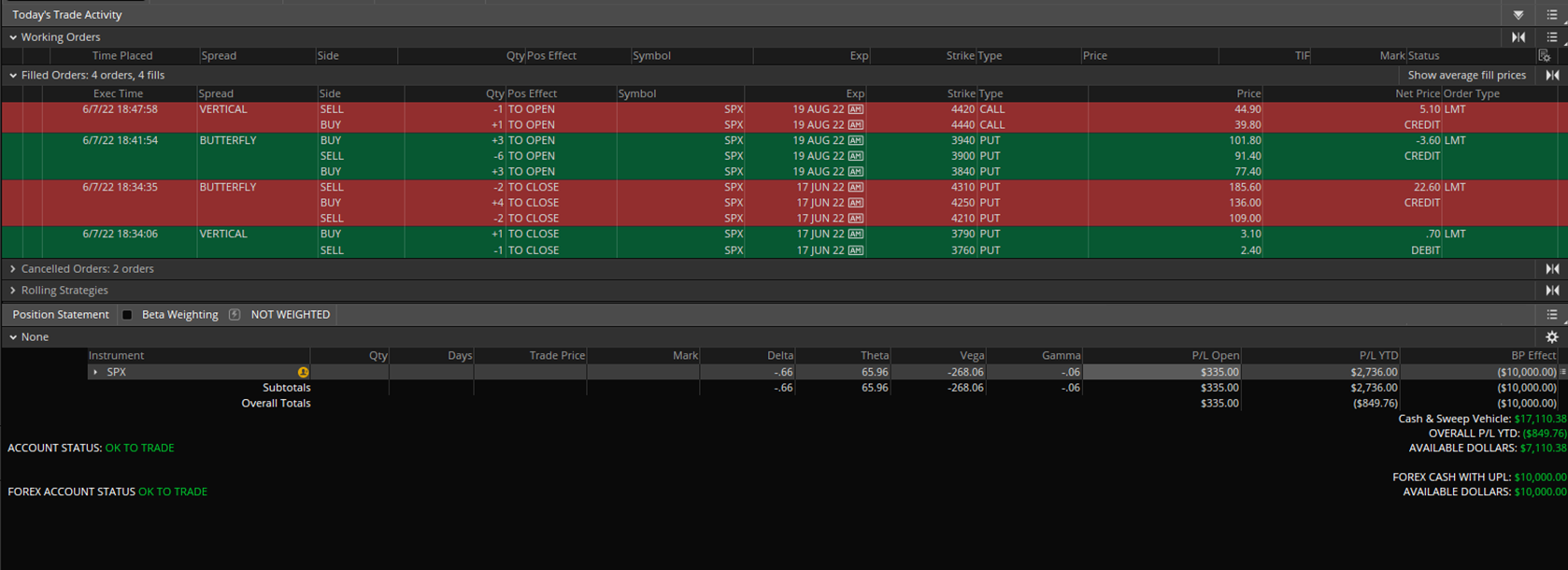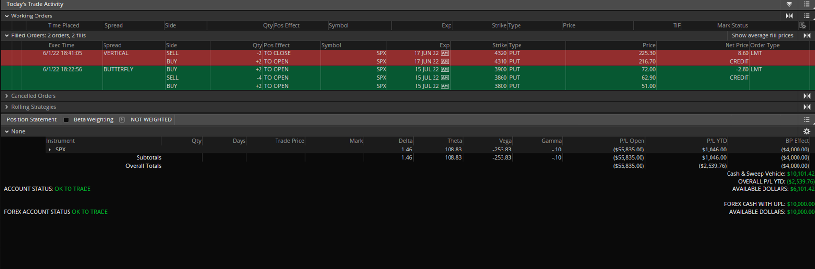 The SPX Moved again down very fast. This penalized the trade and the total Delta became too positive. Therefore we need to adjust. I decided to remove the upper soft hedge Vertical (keeping its profits) and invert the Butterfly structure to be Delta negative. The market may continue to move down and it is better to have this bias that also protects against IV increases.