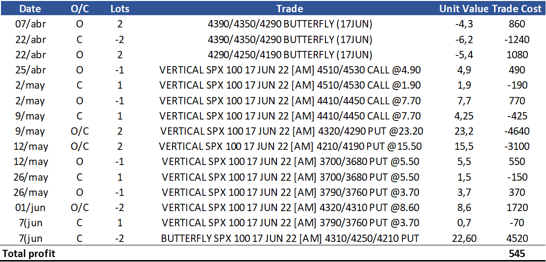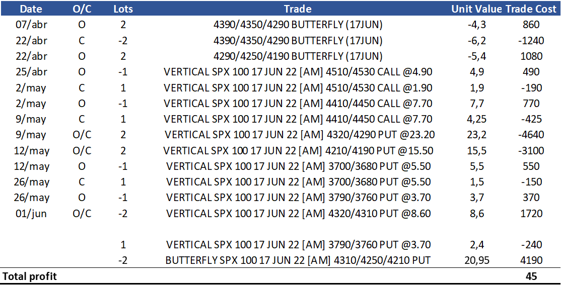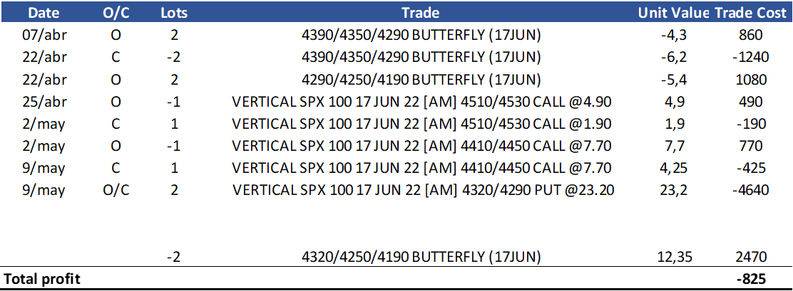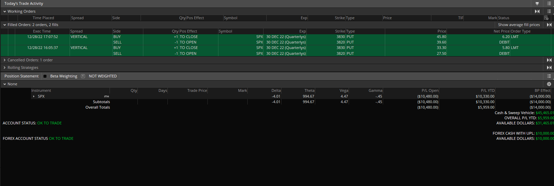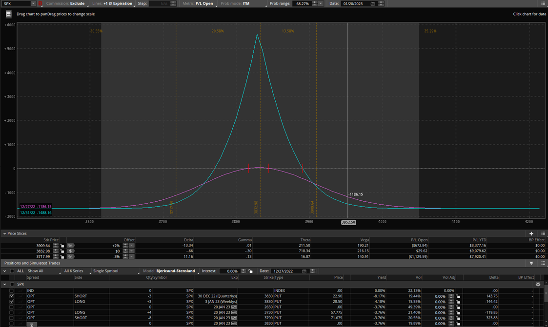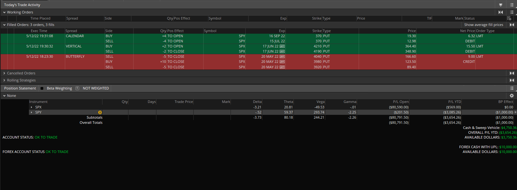 The SPX Moved again down very fast. This penalized the trade and the total Delta became too positive. Therefore we need to adjust. I decided to remove the upper soft hedge Vertical (keeping its profits) and invert the Butterfly structure to be Delta negative. The market may continue to move down and it is better to have this bias that also protects against IV increases.