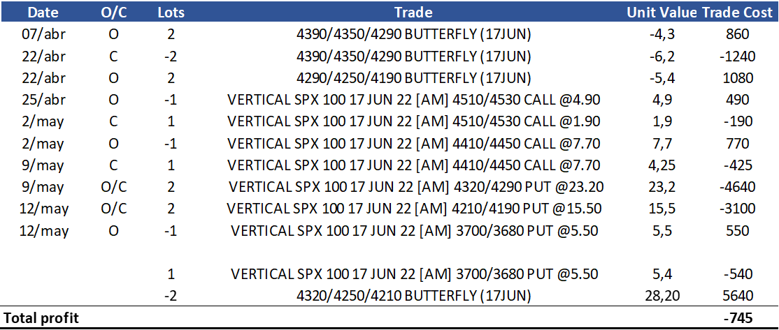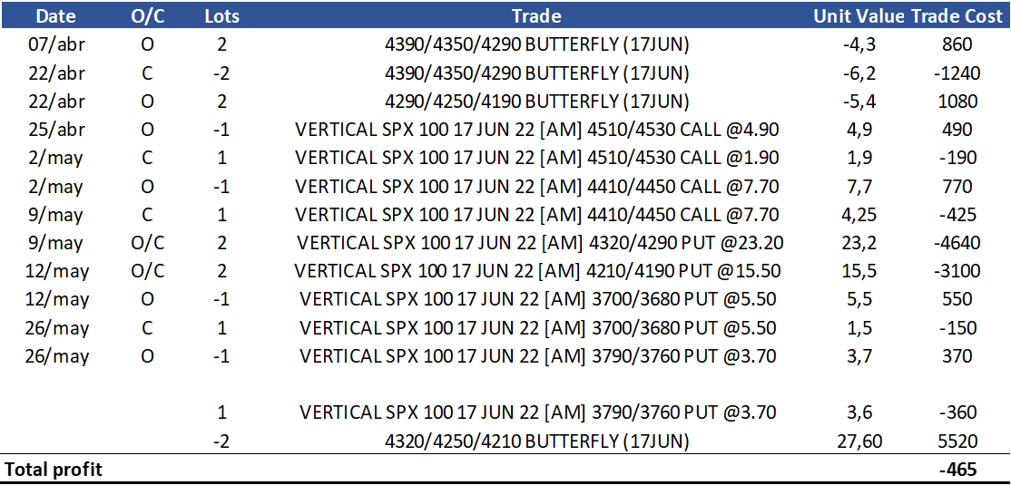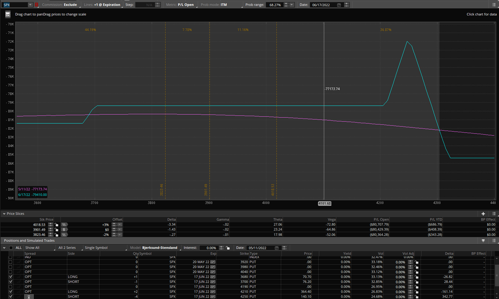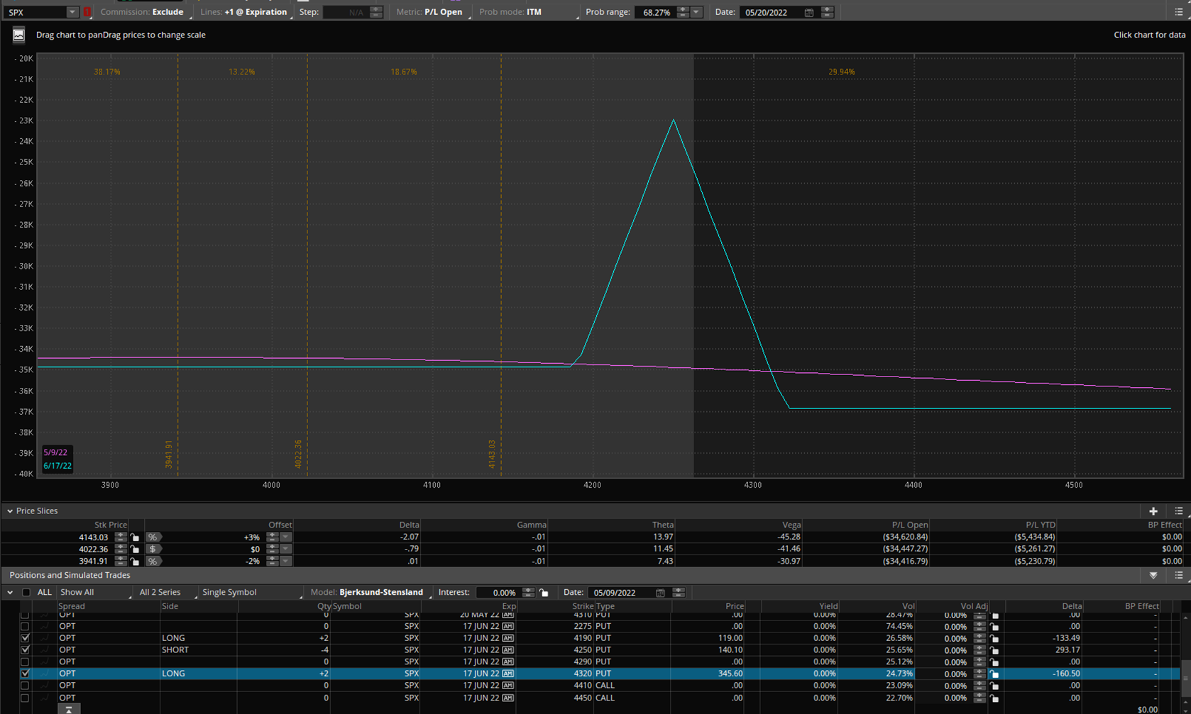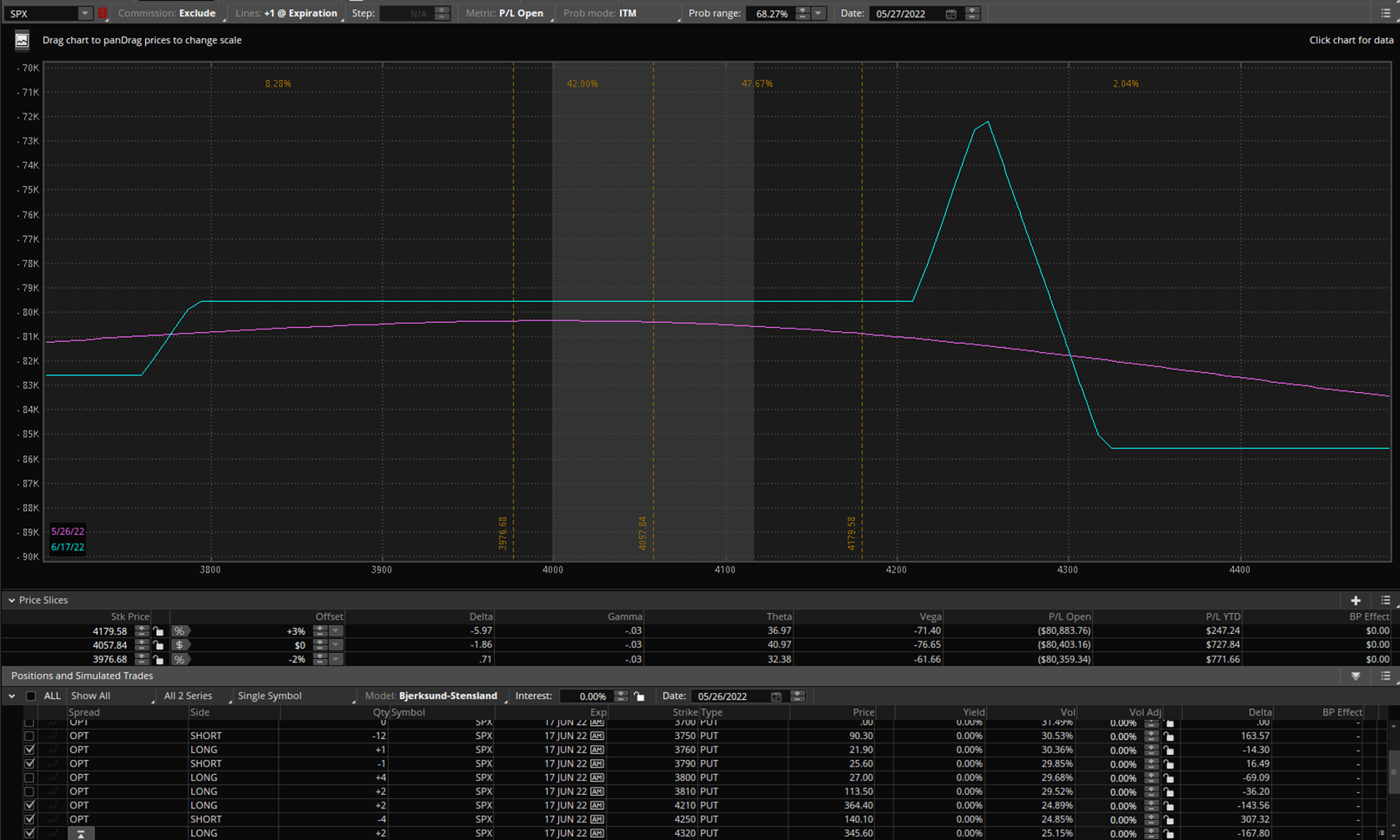 The SPX moved up strongly and closed about +2%. During the last trading hours, the Best Trade became with too high negative Delta (circa -5). I decided to be conservative and lower this directional risk and move up the soft hedge (or the sold Put Vertical). I bought back for a profit the Vertical we opened on 12May and open a new one at higher strikes. This adjustment lowered the trade Delta to about -1 and increased its Theta. We are now better protected in case the market continues its move up tomorrow. I think we should continue to be with negative Delta bias in case the SPX does not break the 4100 level.