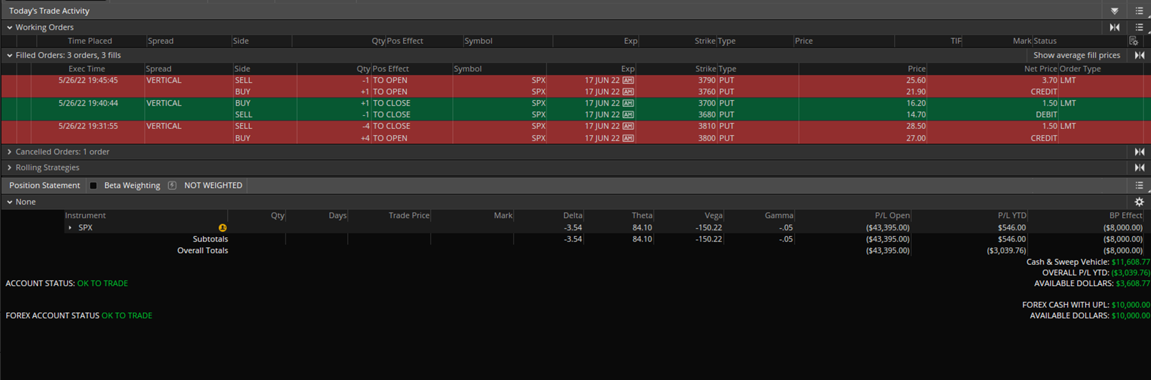 The SPX was most of the day in a strong down move. During this period I decided to add negative Delta to the trade and increase its Theta. I increased the width of the upper butterfly leg to capture more premium. For the last session minutes, the SPX started to recover and I added a short Put Vertical at a lower strong support (3700). This Vertical added a positive Delta, although the total structure trade continued with a small negative Delta. But, it also added additional Theta and capture more premium. I decided to add this Vertical to capture the high premium of this high IV environment. In case the market starts to recover it will deliver fast profits and tend to flatten t0 line.