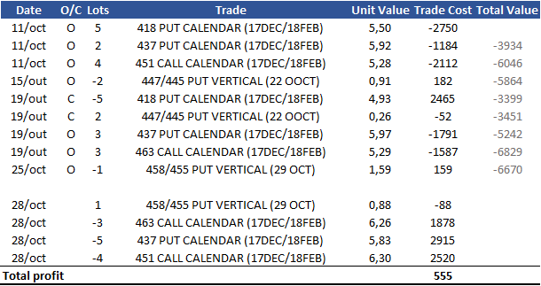 SPX is moving continued to move down (about 0,90% at the time of entry) and the Delta of the trade was again about 5. So, I added another Vertical to "diagonalise" the trade and keep Delta under control. Theta continues massive!