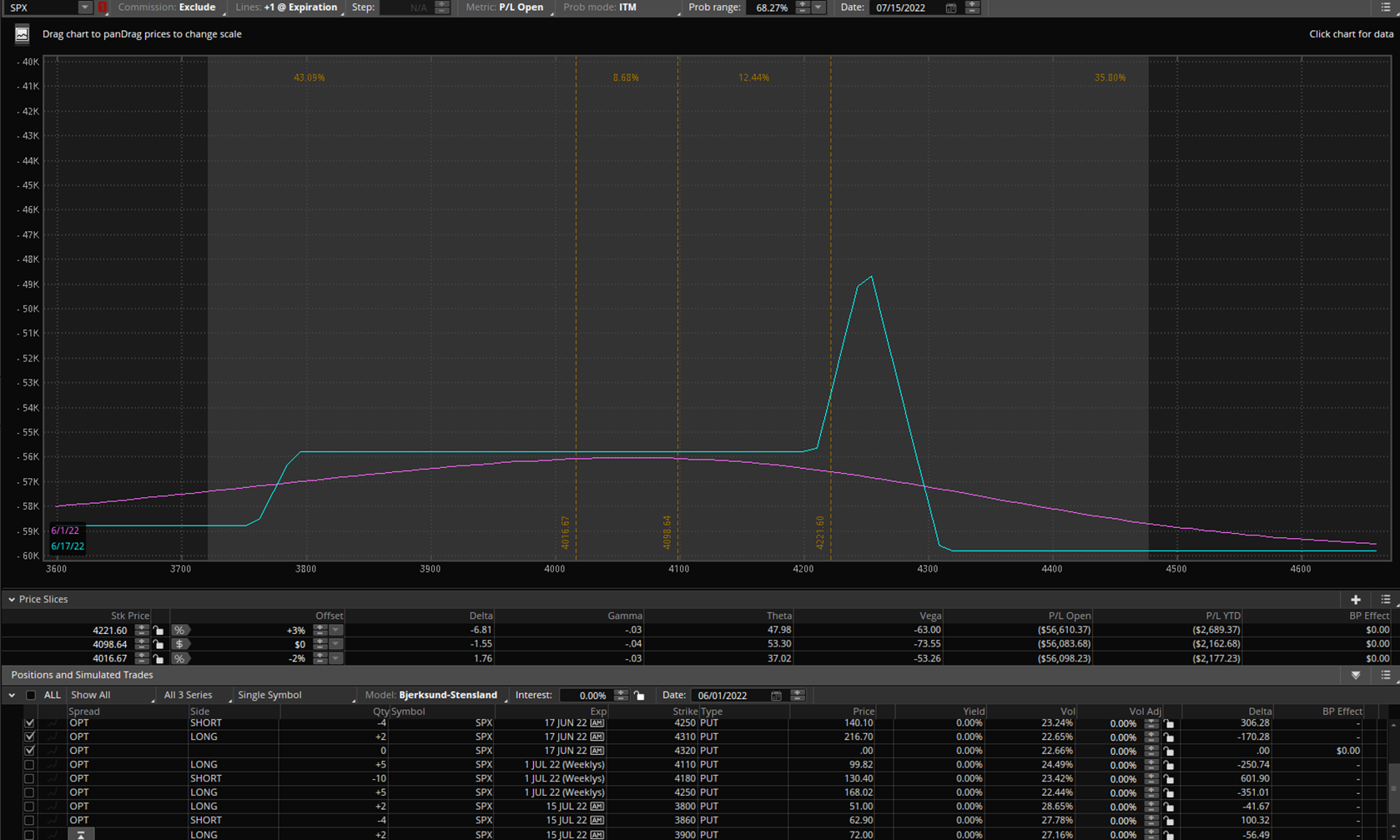 I moved up the "soft hedge", but reduced its 30 width to 20. This is because I decided to be a bit aggressive on the short Call positioning, at 6020. This is circa 30 Delta and above a strong resistance at 6000.