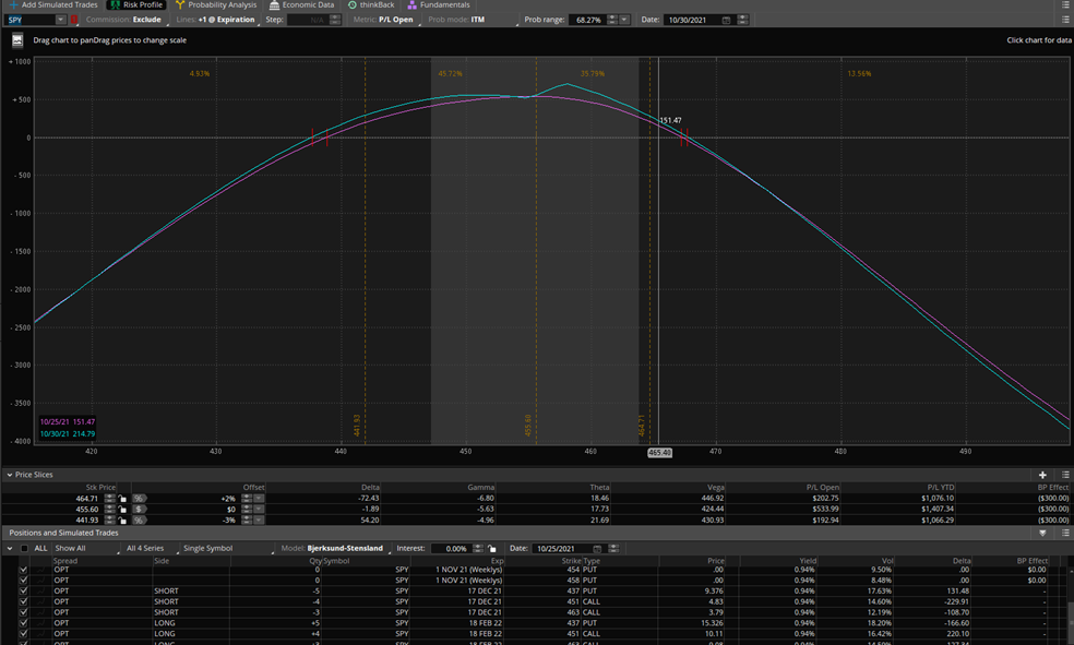 The BWB center strikes at 5350, which is below the strong support at 5410. I maintained the upper wing width with 30 strikes. The BWB trade continues with 60/30, capturing additional premium and increasing positive Delta;