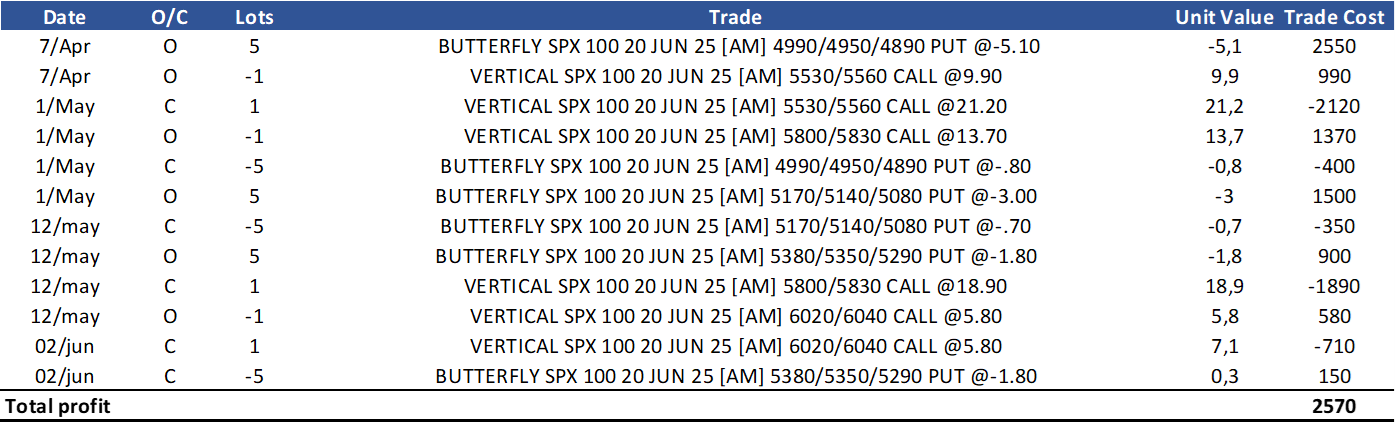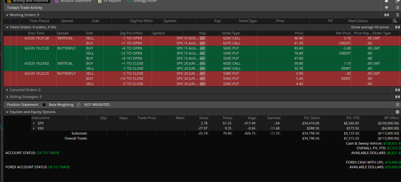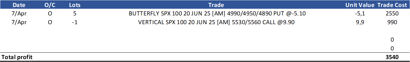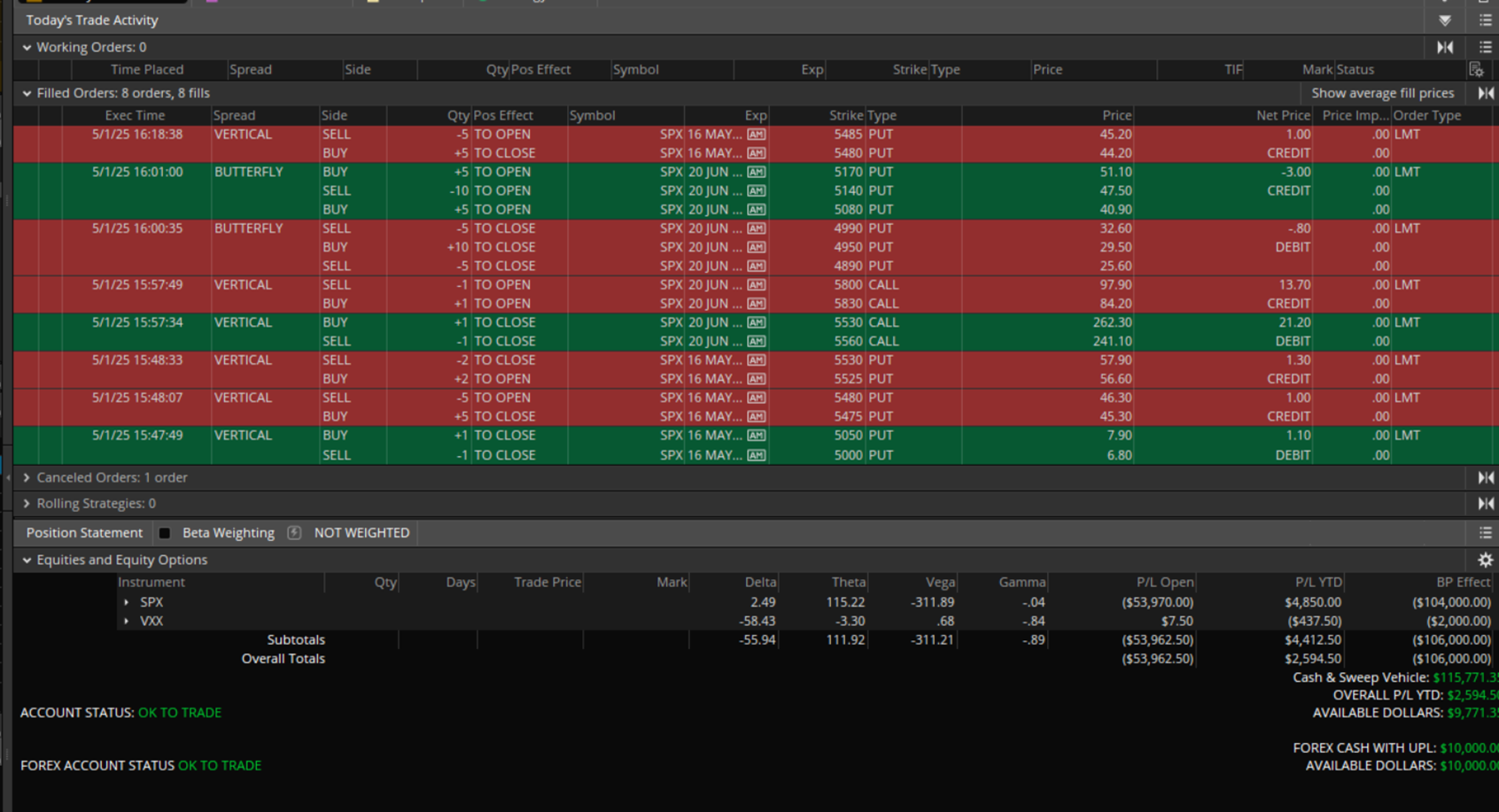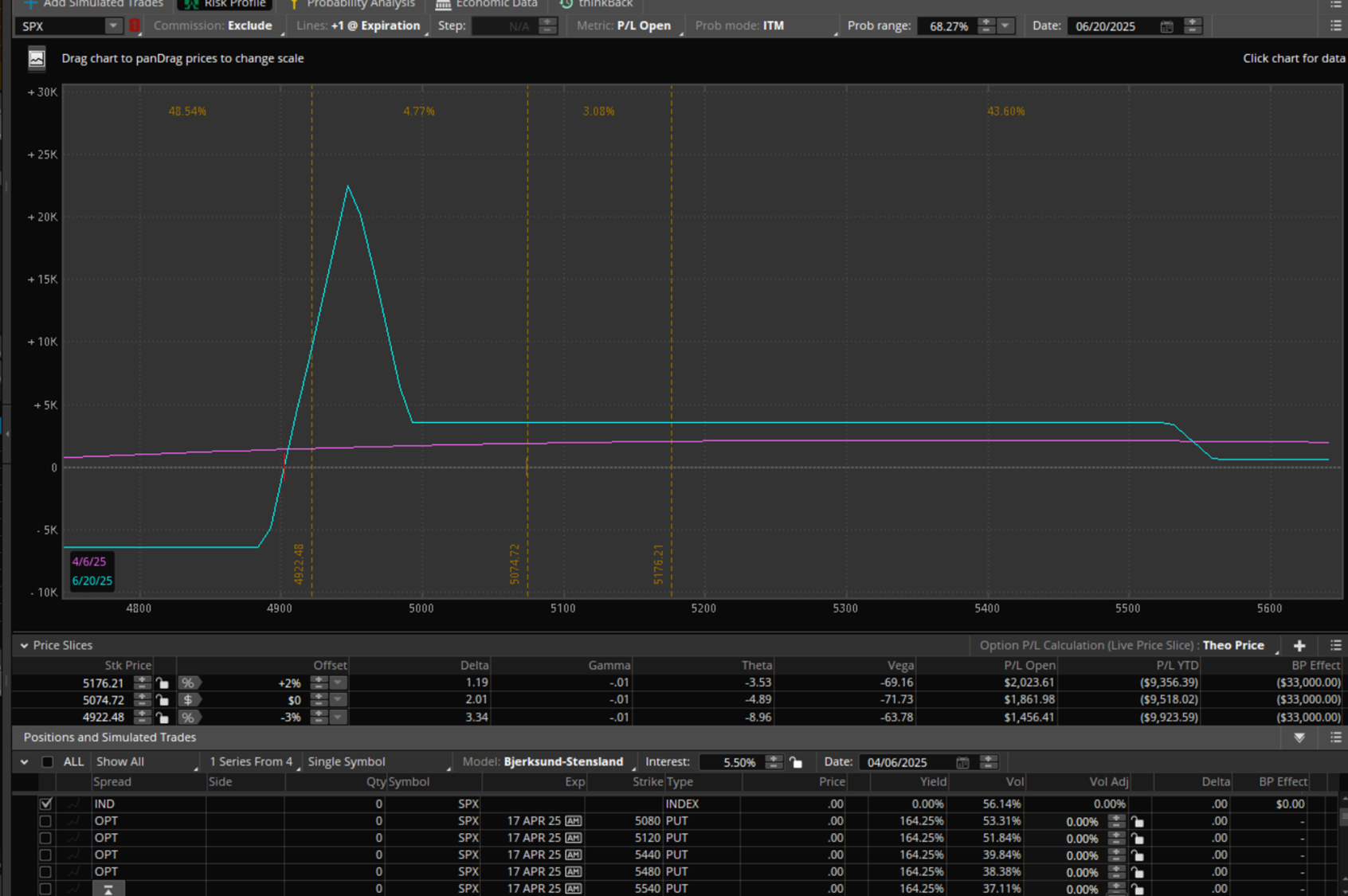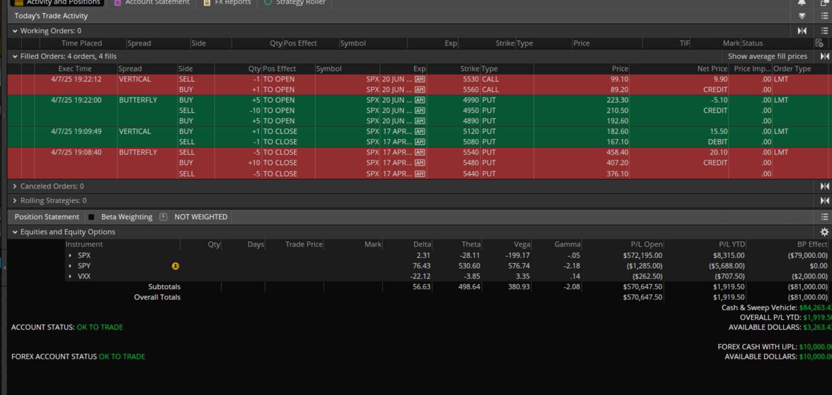 After closing the 17APR, I opened this one with the free-up funds. This will decrease overall portfolio risk because Gamma is much lower on this trade due to longer-dated options (vs 17APR). This trade is also producing an big credit due to the very big IV environment. I am also being a bit aggressive on the positioning of the BWB - short strikes are at 4950 (a bit lower than SPX price at the moment - roughly 5050). The other 2 open SPX Best Trades are inverted and delivering negative Delta - this one delivers positive Delta. I think the market should recover from the big correction due to the tariffs. The trade at open has a +2 Delta having the "soft hedge" with a 20 wide spread that adds some negative Delta to the trade. I positioned its short Call at about 30 Delta strike - a bit aggressive also. Today, this trade has 73 days to expiration (DTE) options.