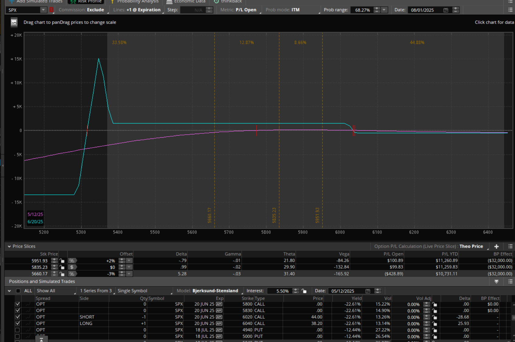 I moved up the "soft hedge, maintaining the 30 width strikes. I positioned the short strike at 5800, above the strong resistance at 5780.