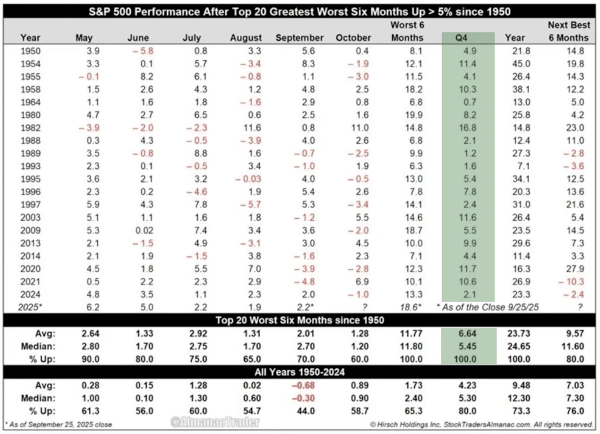 From May until October are the worst 6 months to own stocks since 1950. But when SPX gains 5%+, Q4 has NEVER been negative. The average Q4 return is +6.64% (from Sept 30th close: 6,688).