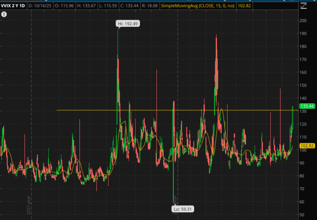 I posted this Chart in the Discord channel: When VVIX rises above 130, it has proven a good idea to start selling Volatility (Short VXX/VIX Call Verticals). It doesn't survive at these levels for very long.