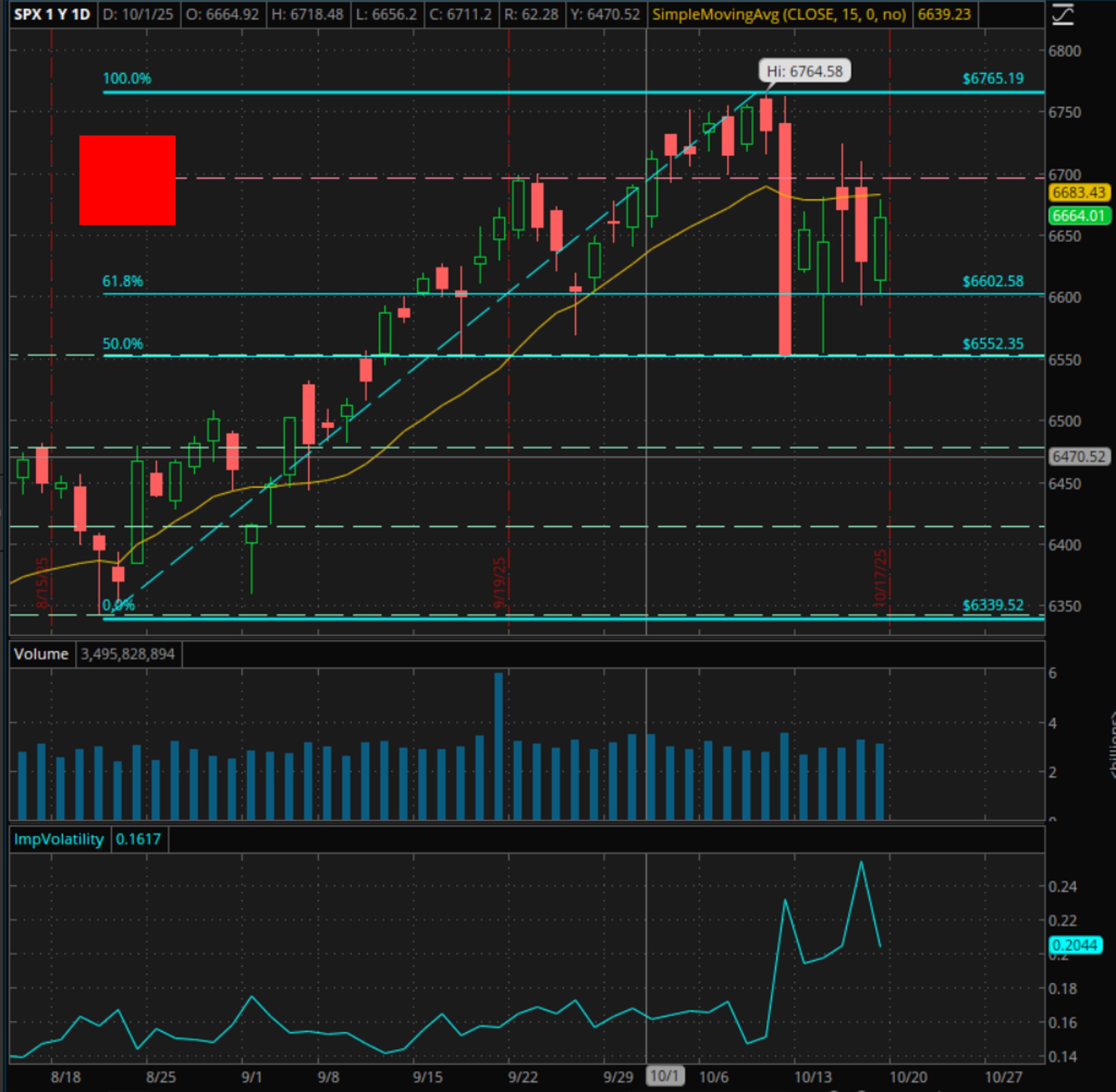 The SPX finished the week at 6,664.01, up about +1.7% (from 6,552.51 on Oct 10), but the price behaviour was very choppy with big swings during the days. The 61.8% Fib retracement acted as support for the SPX, being touched 3 times. Volatility spiked mid-week (VIX briefly ~29 intraday) but closed Friday near ~20.8, well off the highs and slightly below the prior Friday’s close, underscoring a sharp fade in hedging demand into the weekend.