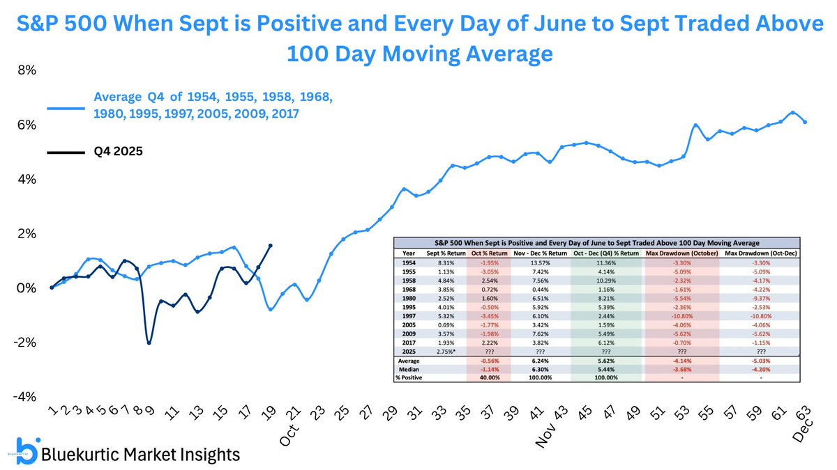 Bluekurtic team: A brief pullback in Oct was expected but came early amid trade tensions with China. When SPX traded above its 100-day MA from June–Sept and Sept ended positive, Nov-Dec was positive 100% of the time, with an average gain of 6%.