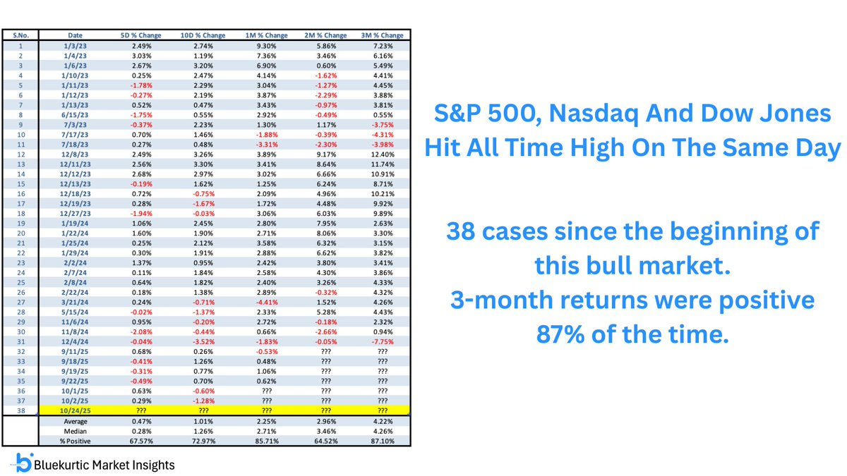 Also from Bluekurtic: On Friday,SPX, NDX and DJIA all hit new all time highs on the same day! A powerful signal of broad market strength. Since this bull market began, it’s happened 38 times, and the forward 3-month returns were positive 87% of the time. Aligns with the base case of a Q4 rally.