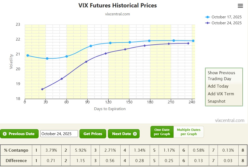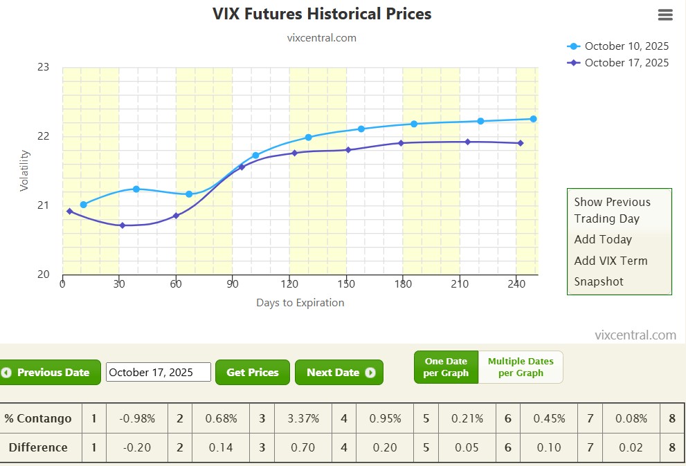 VIX 15–17; curve stays in contango (3% - 6%).