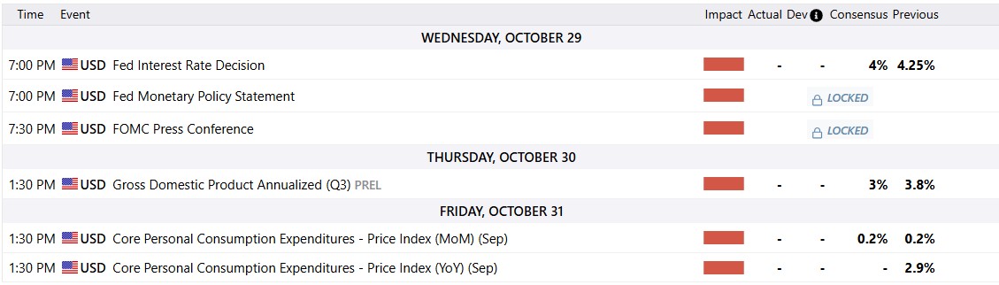 The SPX rose ~1.9% for the week and set a record closing high on Friday at 6,807, lifted by cooler-than-expected September inflation and upbeat earnings. The CPI came in slightly softer than forecasts, reinforcing expectations of another Fed cut, while earnings beats broadened the rally beyond megacap AI names. The S&P Global flash PMIs showed services at a 3-month high and manufacturing in expansion, even as tariffs weighed on export sentiment—supporting the soft-landing narrative. The volatility eased, with the VIX ending near 16.4 on Friday, consistent with risk-on positioning into mega-cap earnings next week (AMZN, AAPL, GOOG, META, MSFT).