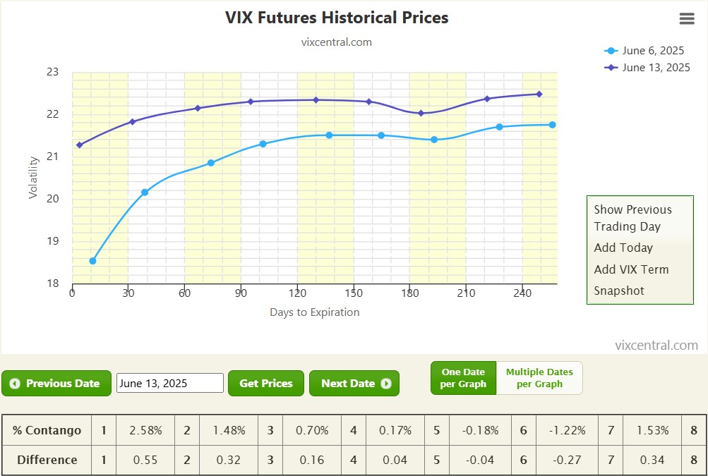 The SPX erased the prior week’s gains, finishing at 5,977—down 1.1% on Friday—driven largely by heightened geopolitical tensions in the Middle East. Israel’s attack on Iranian nuclear sites triggered a surge in crude oil prices (+7%), which fueled investor anxiety and risk-off sentiment. For the week, the SPX posted a −0.4% loss, halting its two-week winning streak and reflecting broader market hesitation amid global uncertainty. The VIX spiked from ~17 to approximately 20.8 by Friday, marking a ~22% increase for the week. This sharp rise underscores growing fear in the market following the escalation. The VIX futures curve remains in contango, though at a shallow level (2.8%), signaling lingering uncertainty that could either intensify or ease depending on weekend developments. The weekend's geopolitical news may set the tone for early-week trading, as investors watch for further escalation or de-escalation signals that could define near-term direction.
