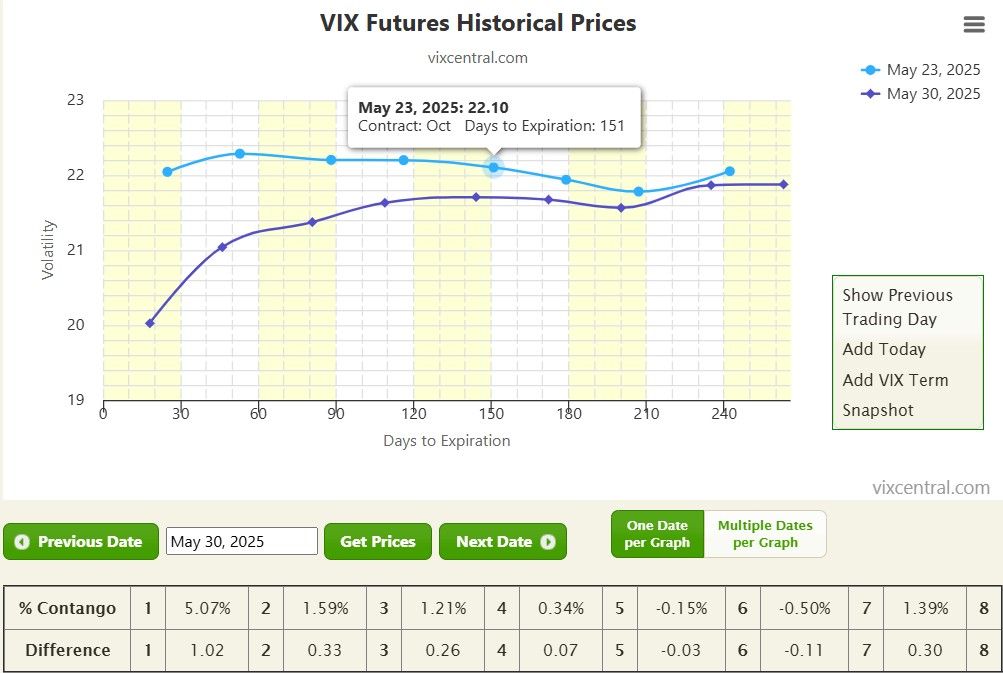 The SPX rebounded during the week of May 26–30, 2025, closing at 5,911.69, a gain of 1.9% (+109.69 points) from the previous week's close of 5,802. It also broke up the strong resistance at 5870, although printing a lower high. This recovery followed a prior decline driven by trade tensions, with investor sentiment improving due to easing concerns over tariffs and encouraging inflation data. The VIX decreased to 18.57, down from 22.14 the previous week, indicating reduced market volatility and a shift back to a more stable environment. The VIX futures curve steepened, moving further into Contango, reflecting expectations of continued market stability (but the SPX lower high may indicate some small corrective move).