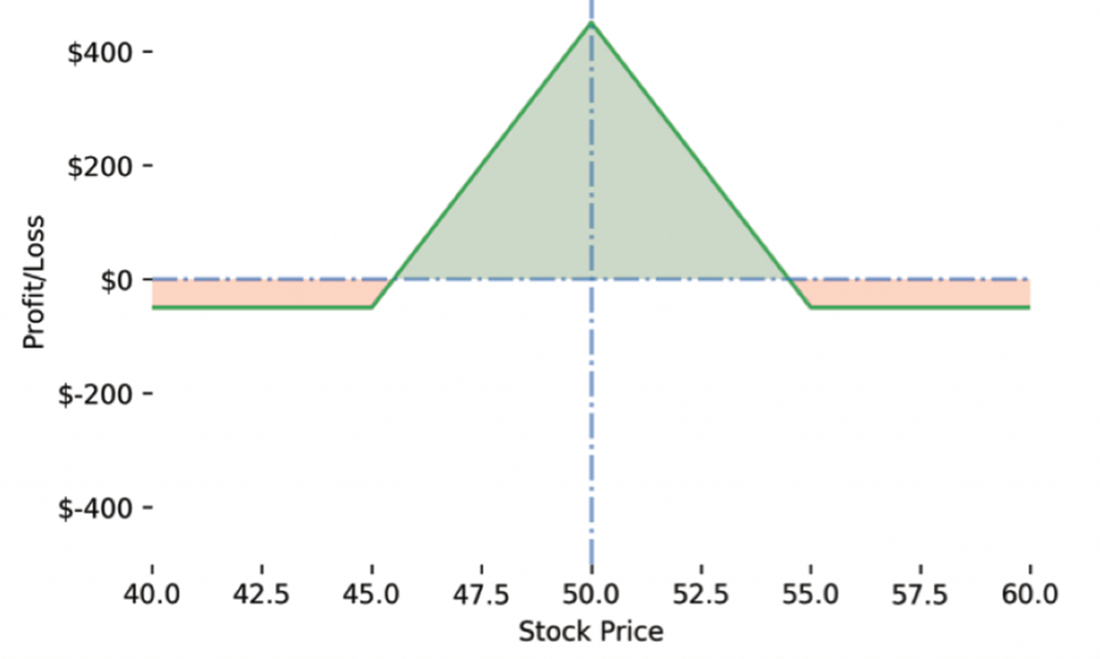- Butterfly spread: Buy 1 XYZ $45 call option, sell 2 XYZ $50 call options, buy 1 XYZ $55 call option