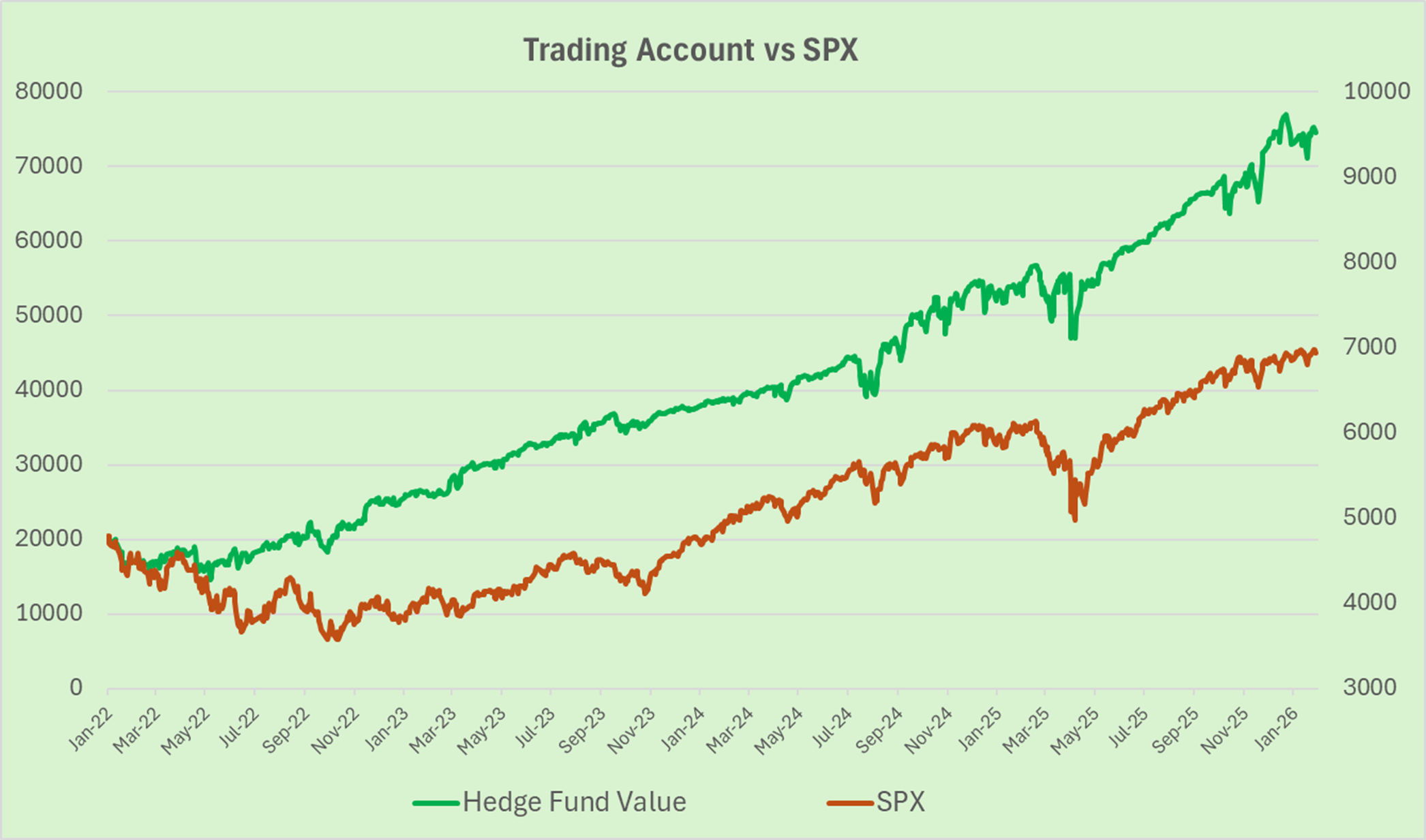 The Investment Fund closed the month and year with a value of $74.5k (+2.1% YTD) - a gain of circa $1500 for the month. The 50% annual return goal is within our sight and, for the moment, we have succeeded in beating the SPX. The Fund continues to have a target of 50% annual return for 2026.